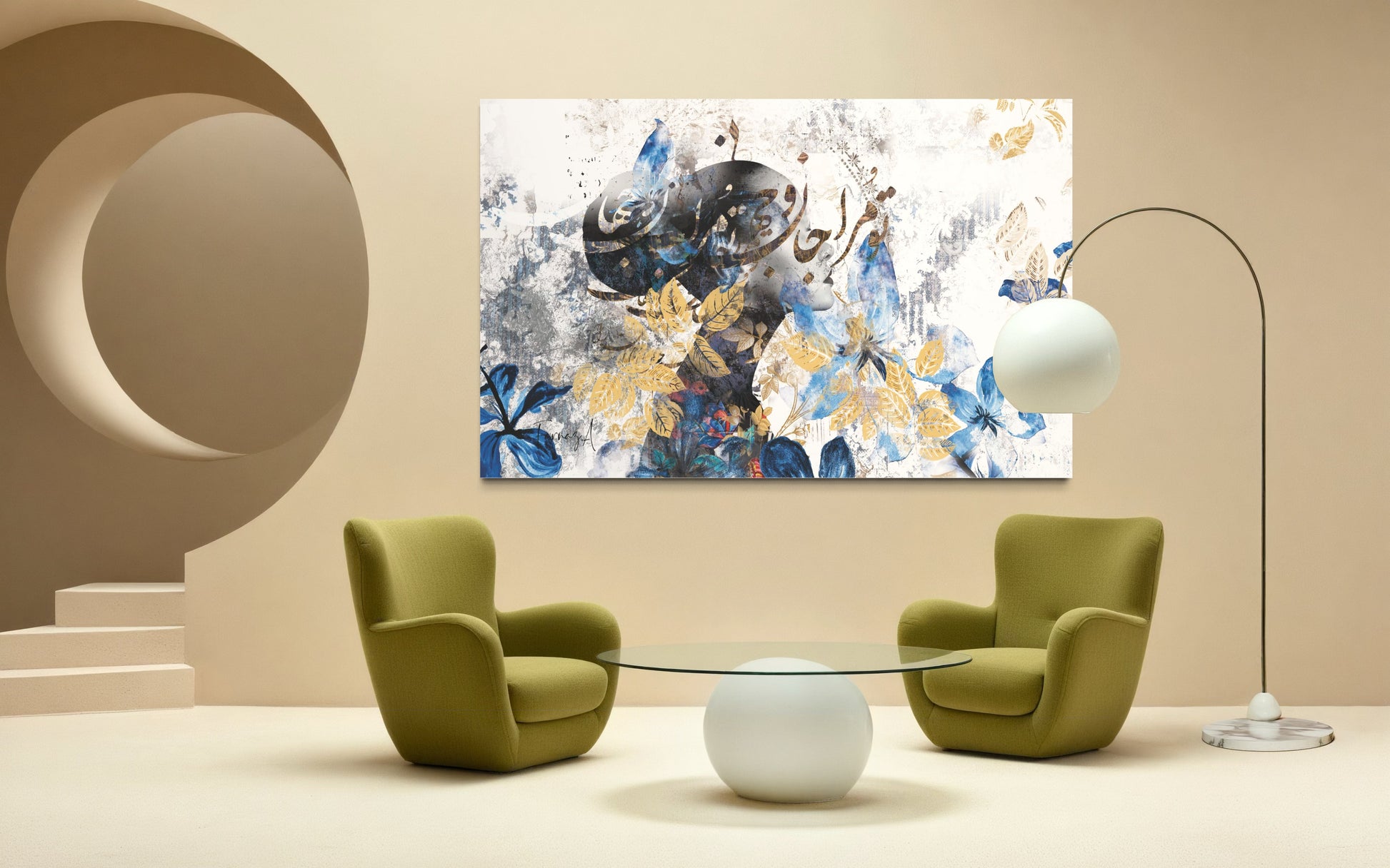 This contemporary artwork blends modern digital portraiture with traditional Persian calligraphy, symbolizing the harmony between heritage and modernity.