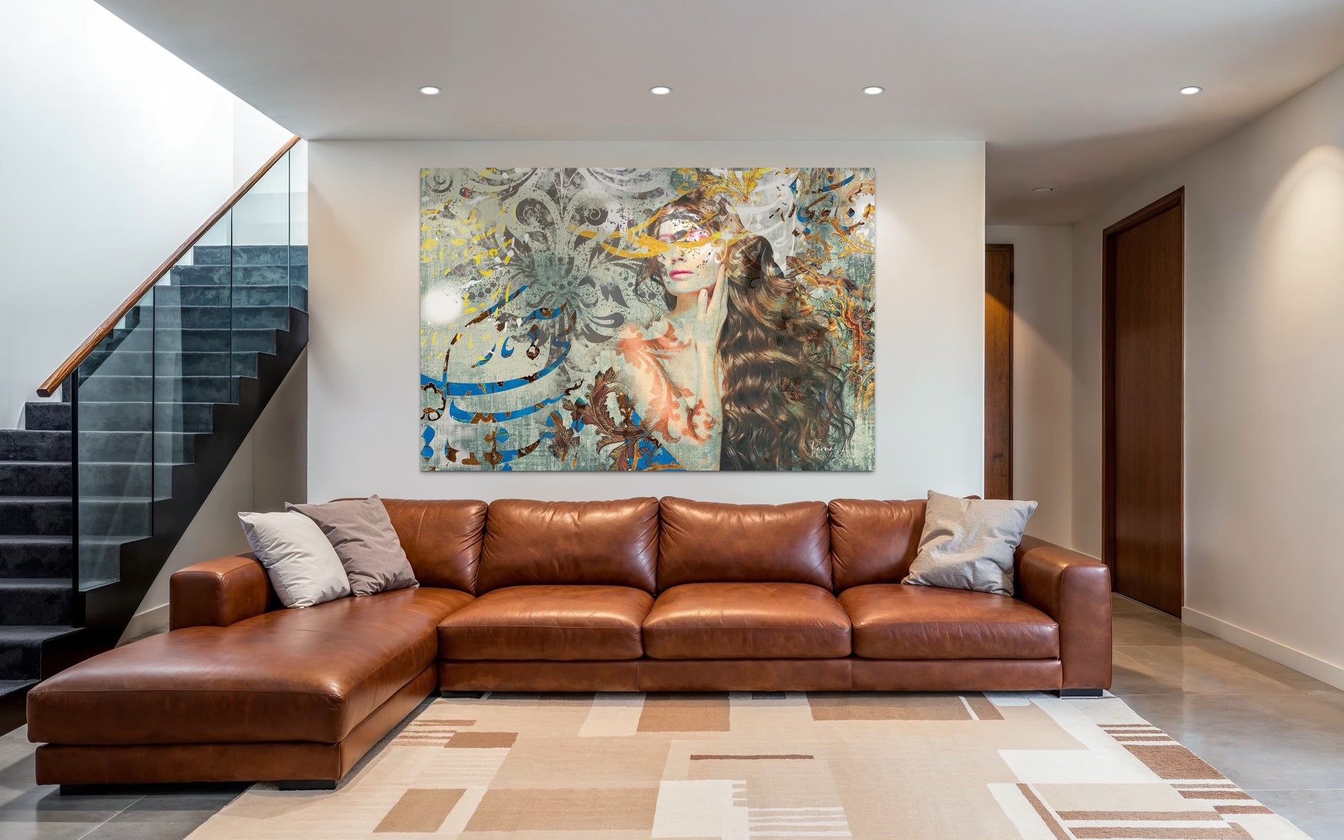 This contemporary artwork blends modern digital portraiture with traditional Persian calligraphy, symbolizing the harmony between heritage and modernity.
