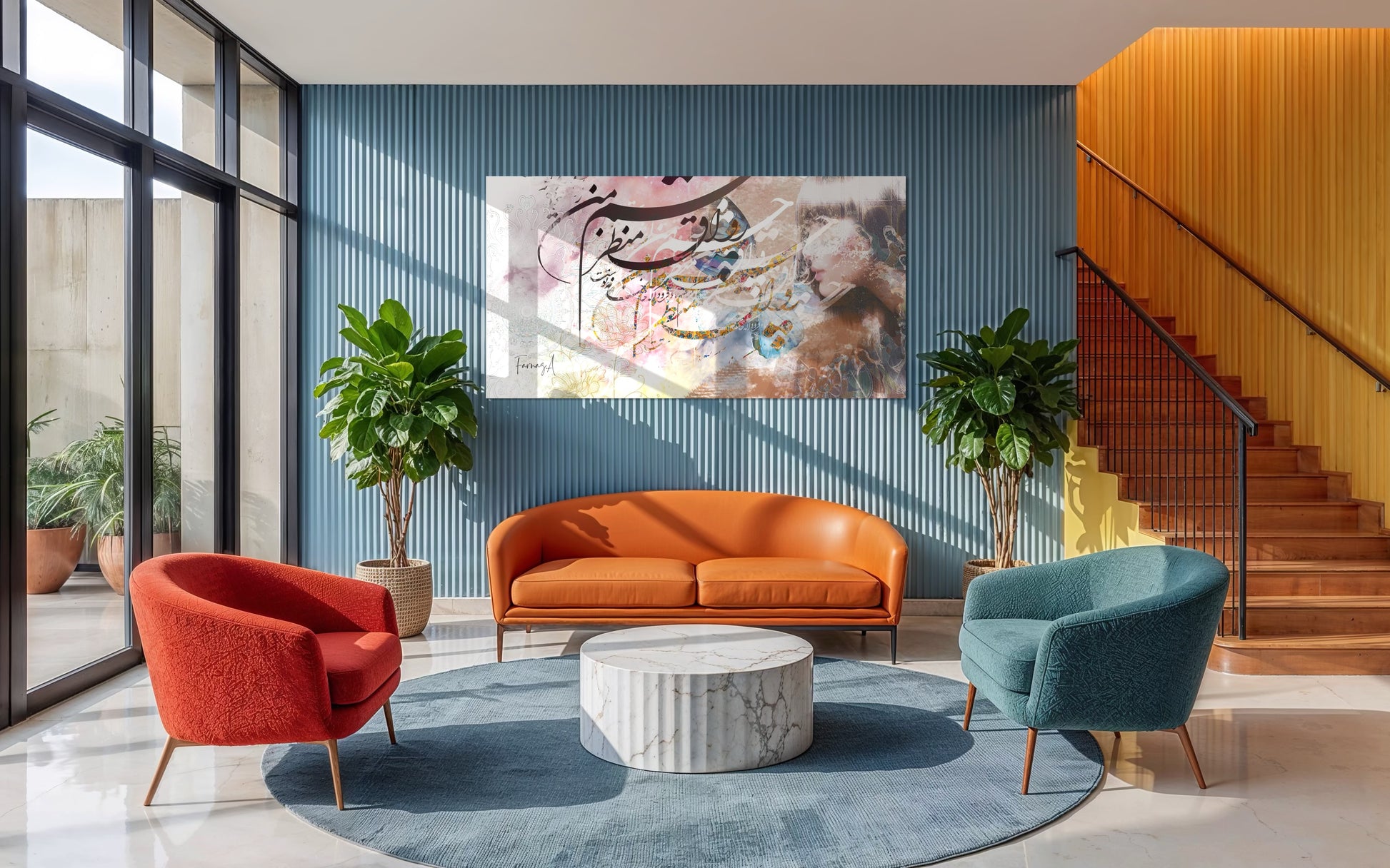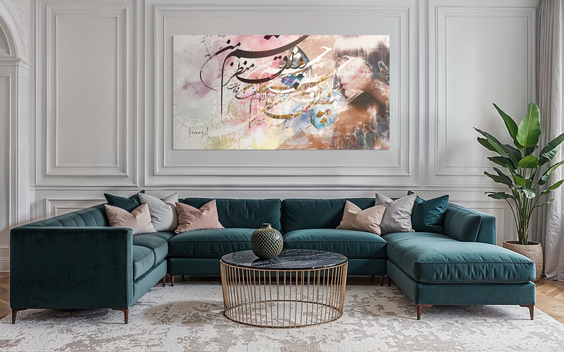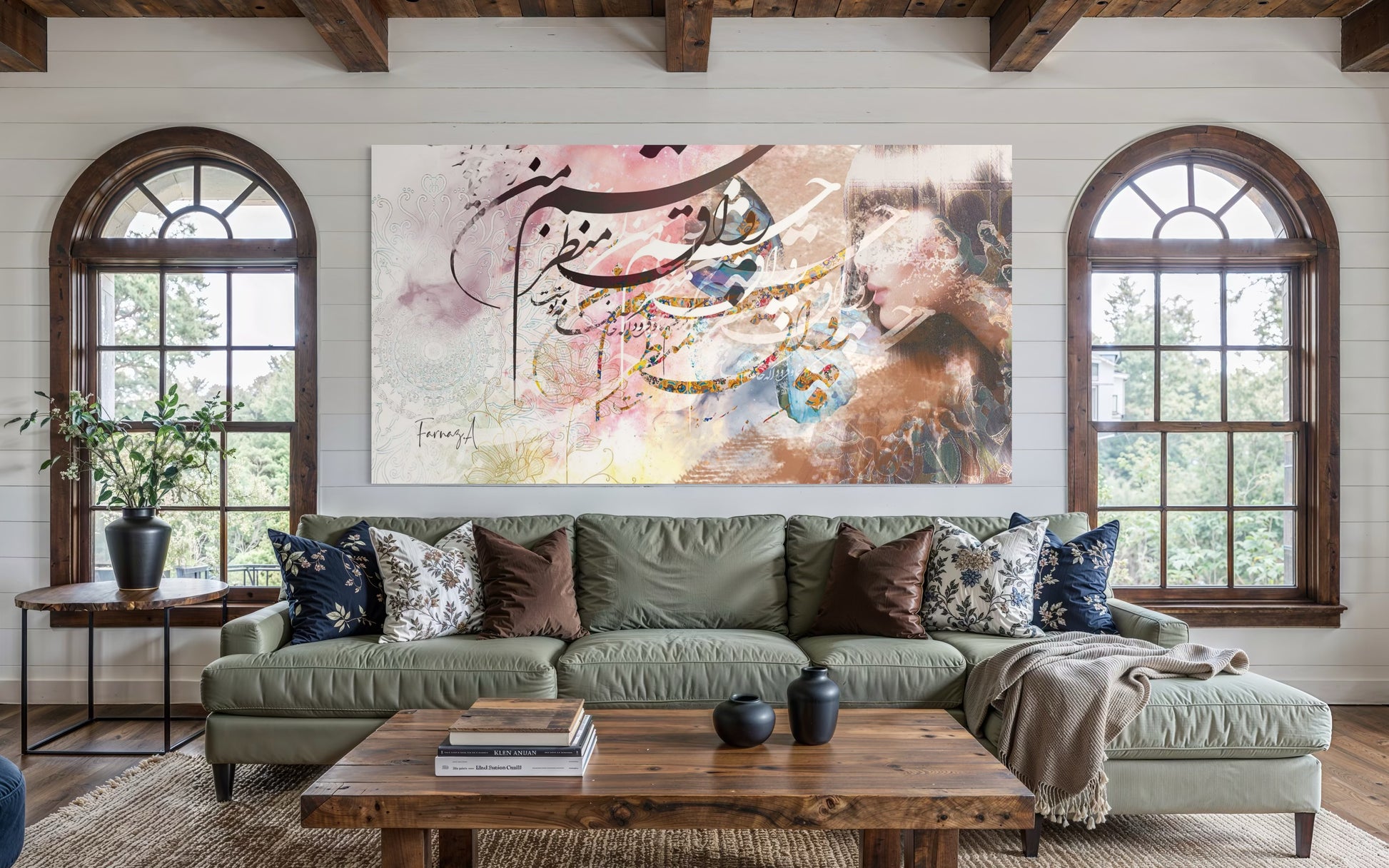 This contemporary artwork blends modern digital portraiture with traditional Persian calligraphy, symbolizing the harmony between heritage and modernity.